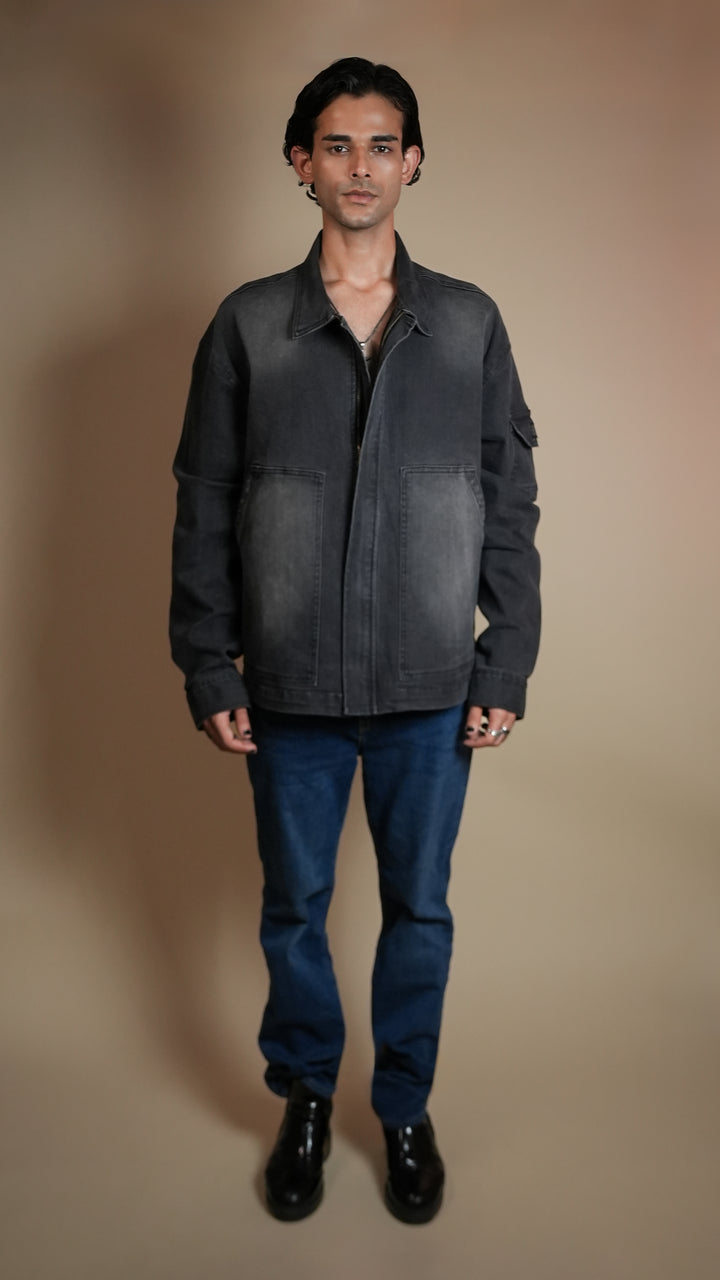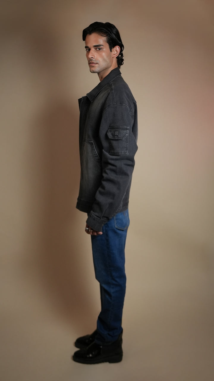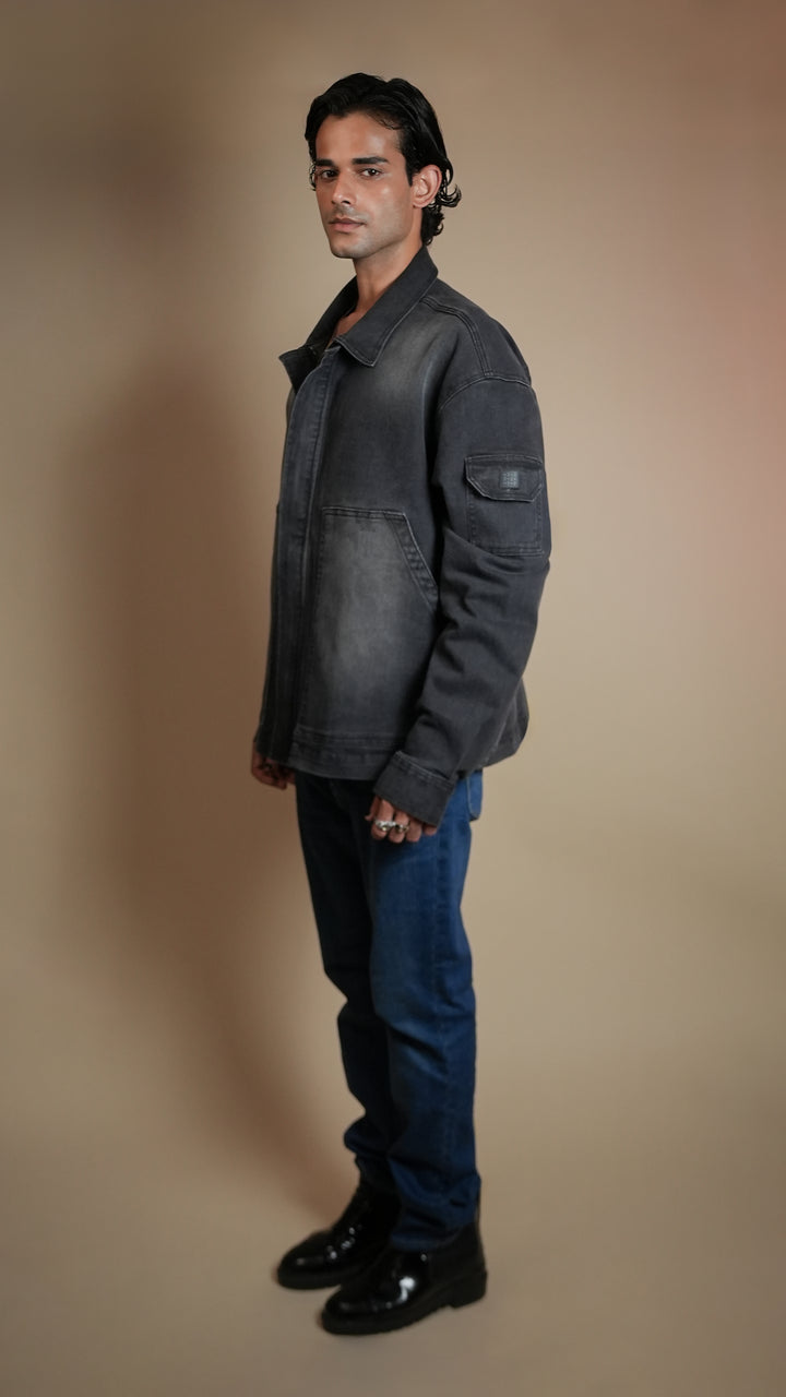 Crafted from 12.5 oz stretch charcoal denim, this jacket is built with a biker edge. Washed with KMnO4 for a rugged finish, it features a concealed zipper, oversized patch pockets, and a utility sleeve pocket. Finished with a YKK long zipper, this piece blends functionality with a bold, street-ready silhouette.