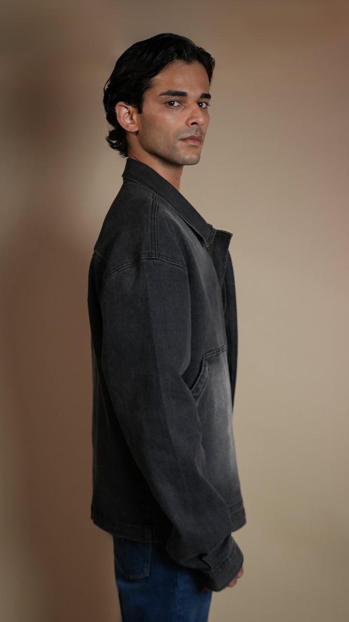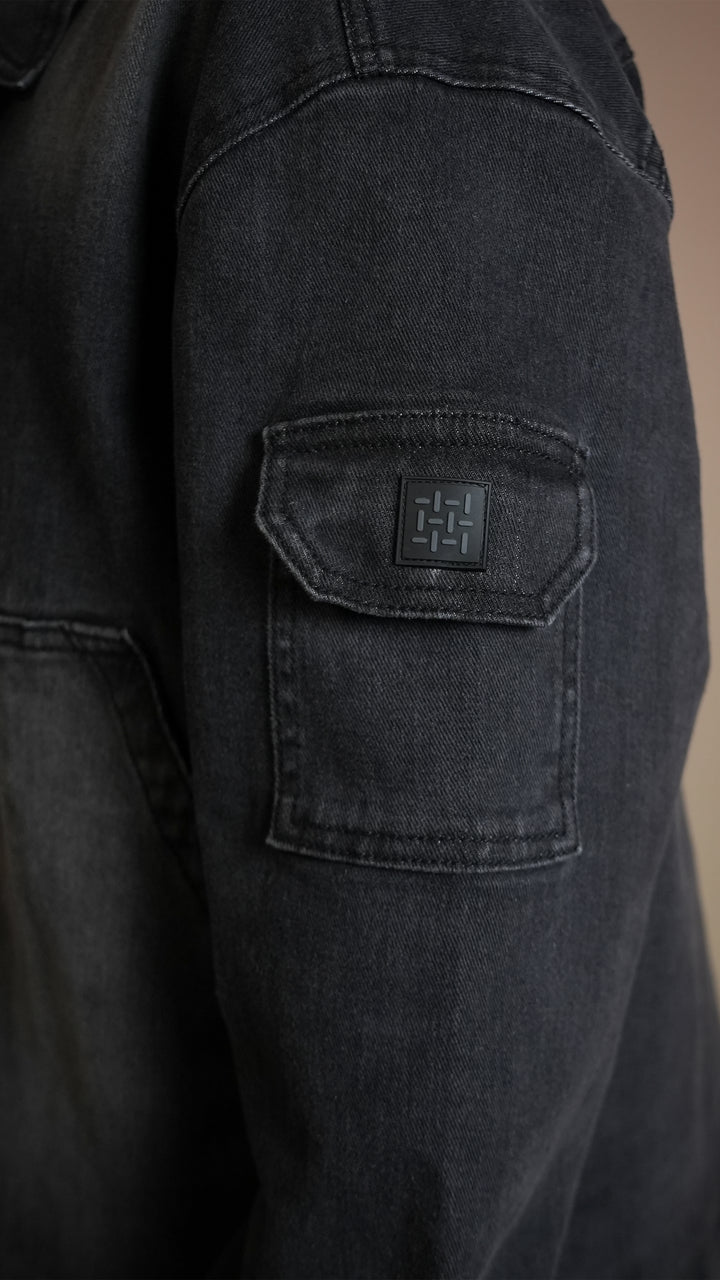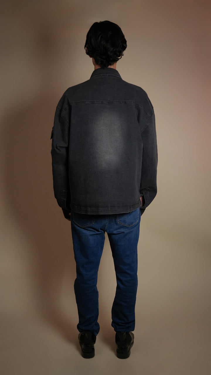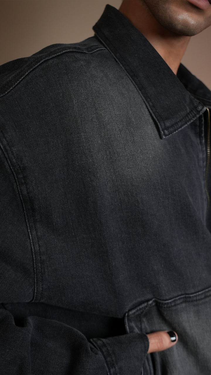 Crafted from 12.5 oz stretch charcoal denim, this jacket is built with a biker edge. Washed with KMnO4 for a rugged finish, it features a concealed zipper, oversized patch pockets, and a utility sleeve pocket. Finished with a YKK long zipper, this piece blends functionality with a bold, street-ready silhouette.