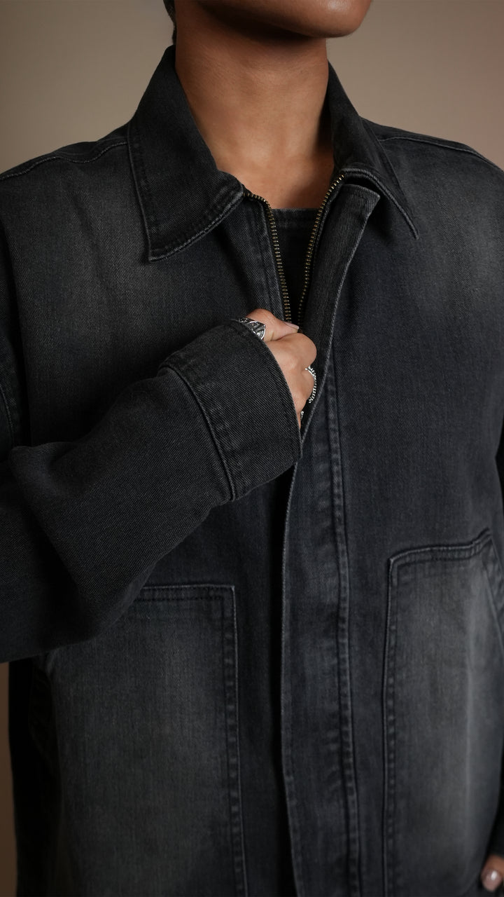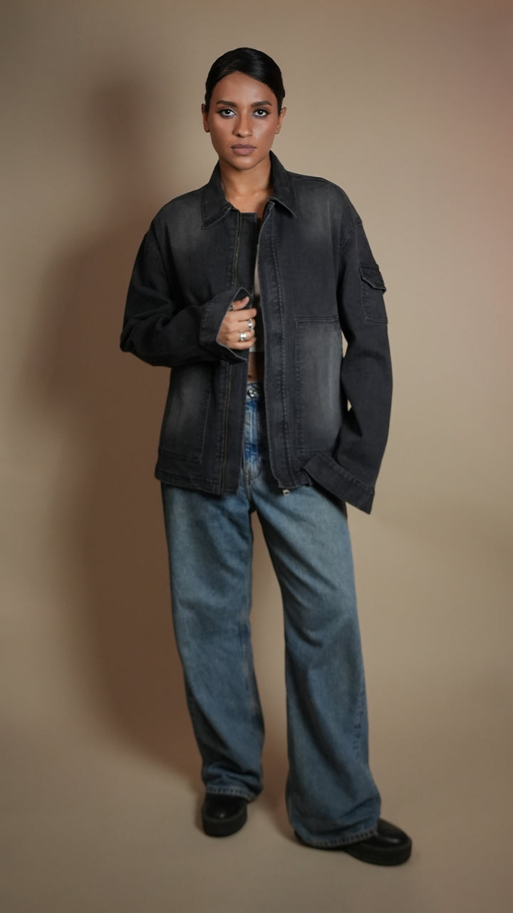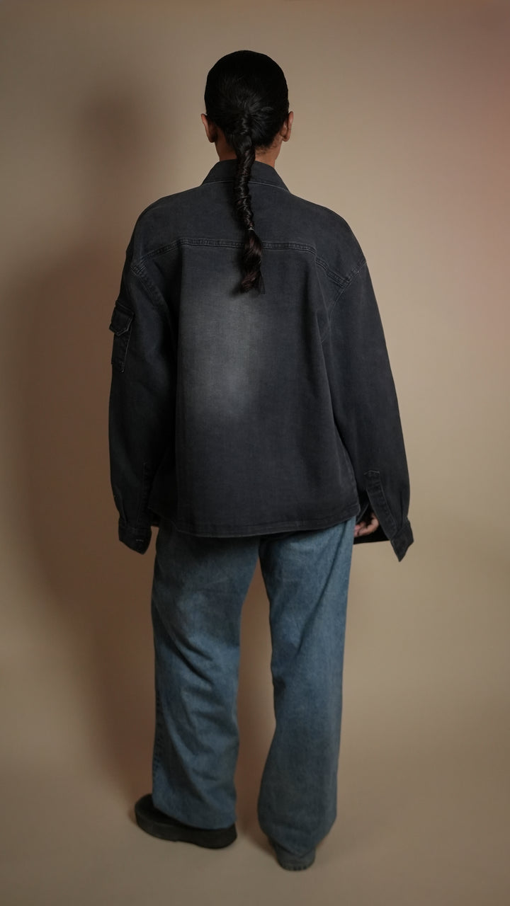 Crafted from 12.5 oz stretch charcoal denim, this jacket is built with a biker edge. Washed with KMnO4 for a rugged finish, it features a concealed zipper, oversized patch pockets, and a utility sleeve pocket. Finished with a YKK long zipper, this piece blends functionality with a bold, street-ready silhouette.