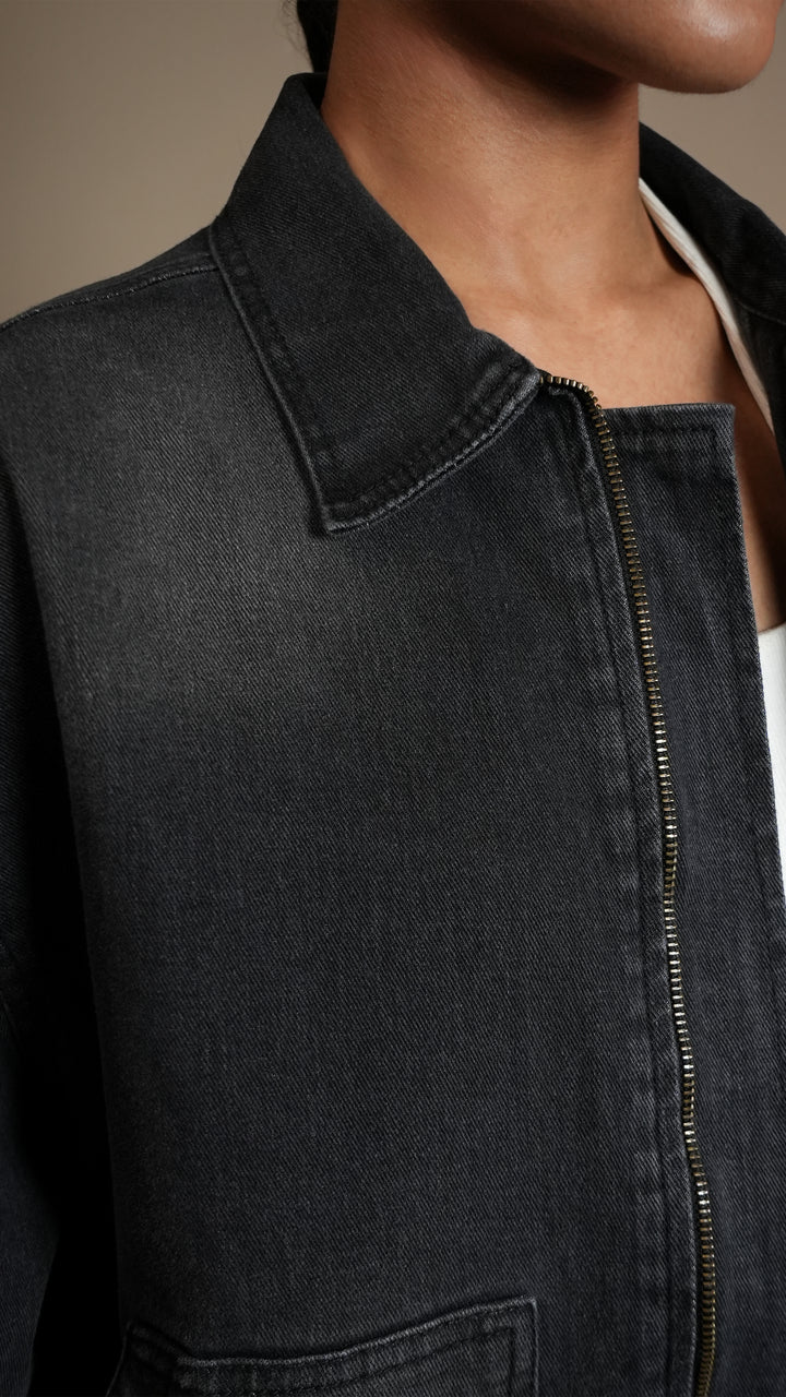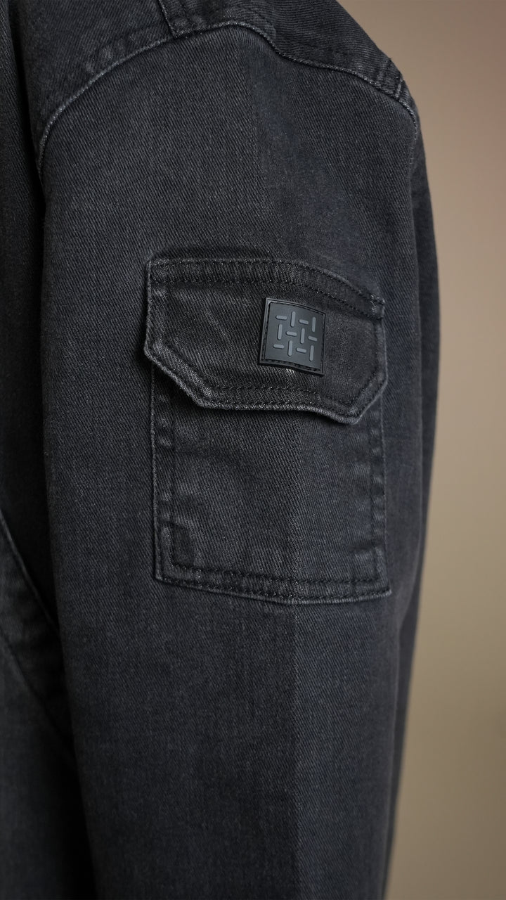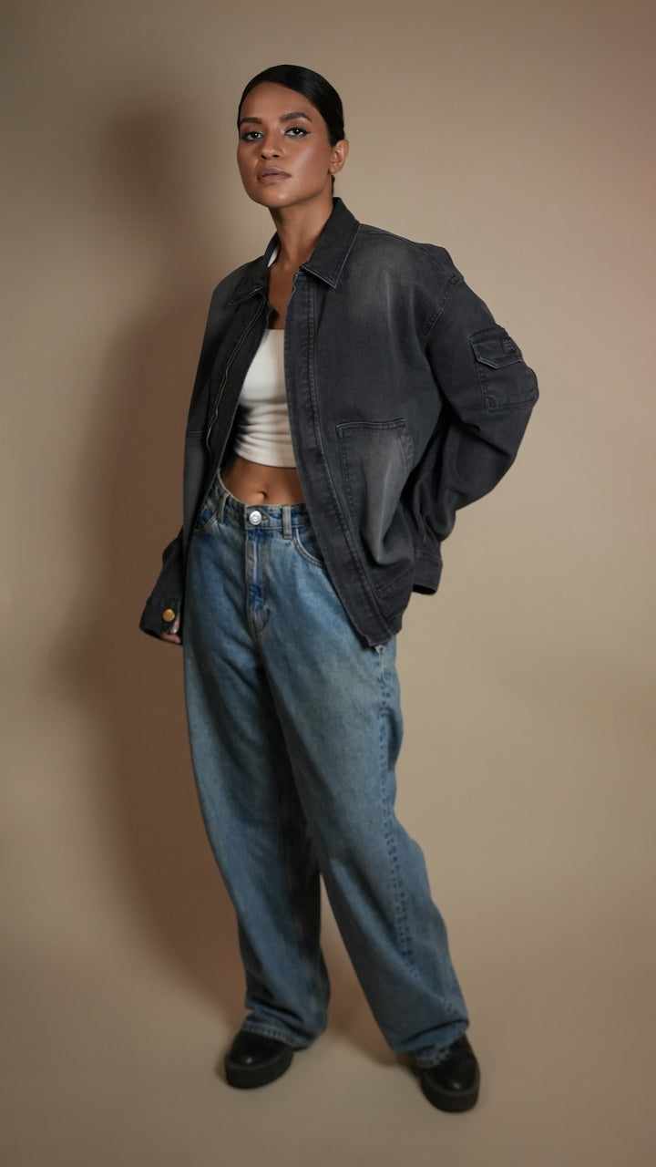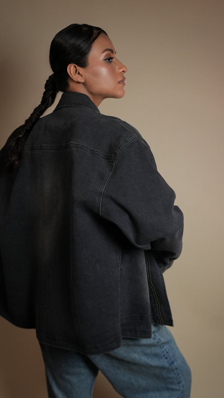 Crafted from 12.5 oz stretch charcoal denim, this jacket is built with a biker edge. Washed with KMnO4 for a rugged finish, it features a concealed zipper, oversized patch pockets, and a utility sleeve pocket. Finished with a YKK long zipper, this piece blends functionality with a bold, street-ready silhouette.