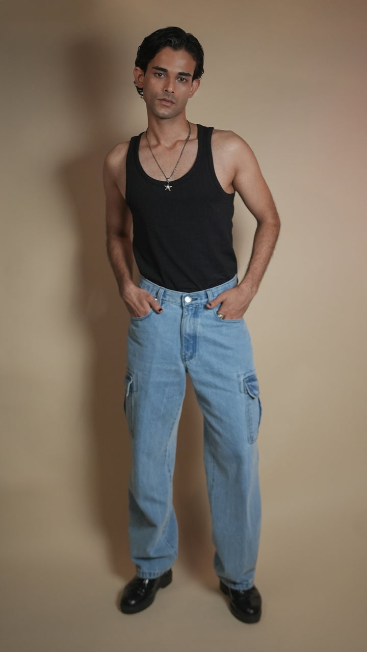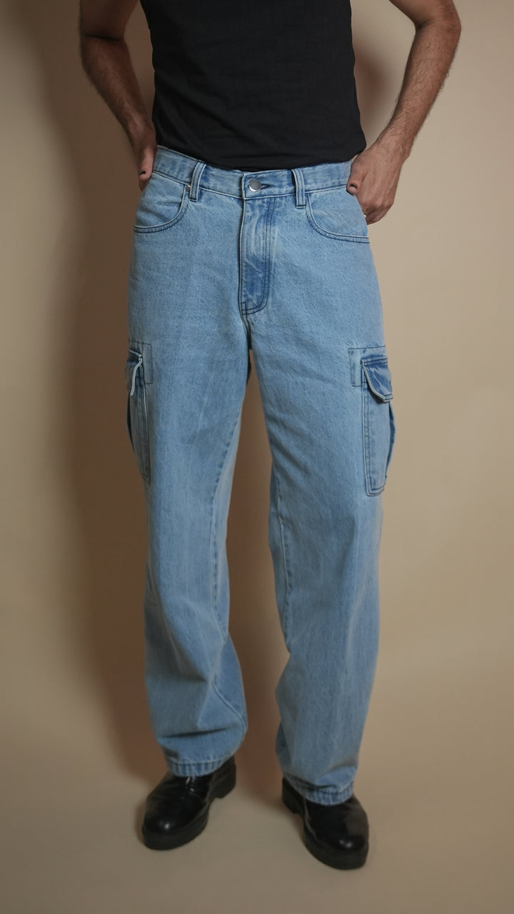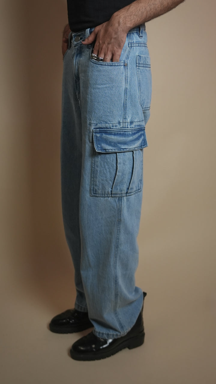 Ice-blue denim, cargo pockets, relaxed utility style
