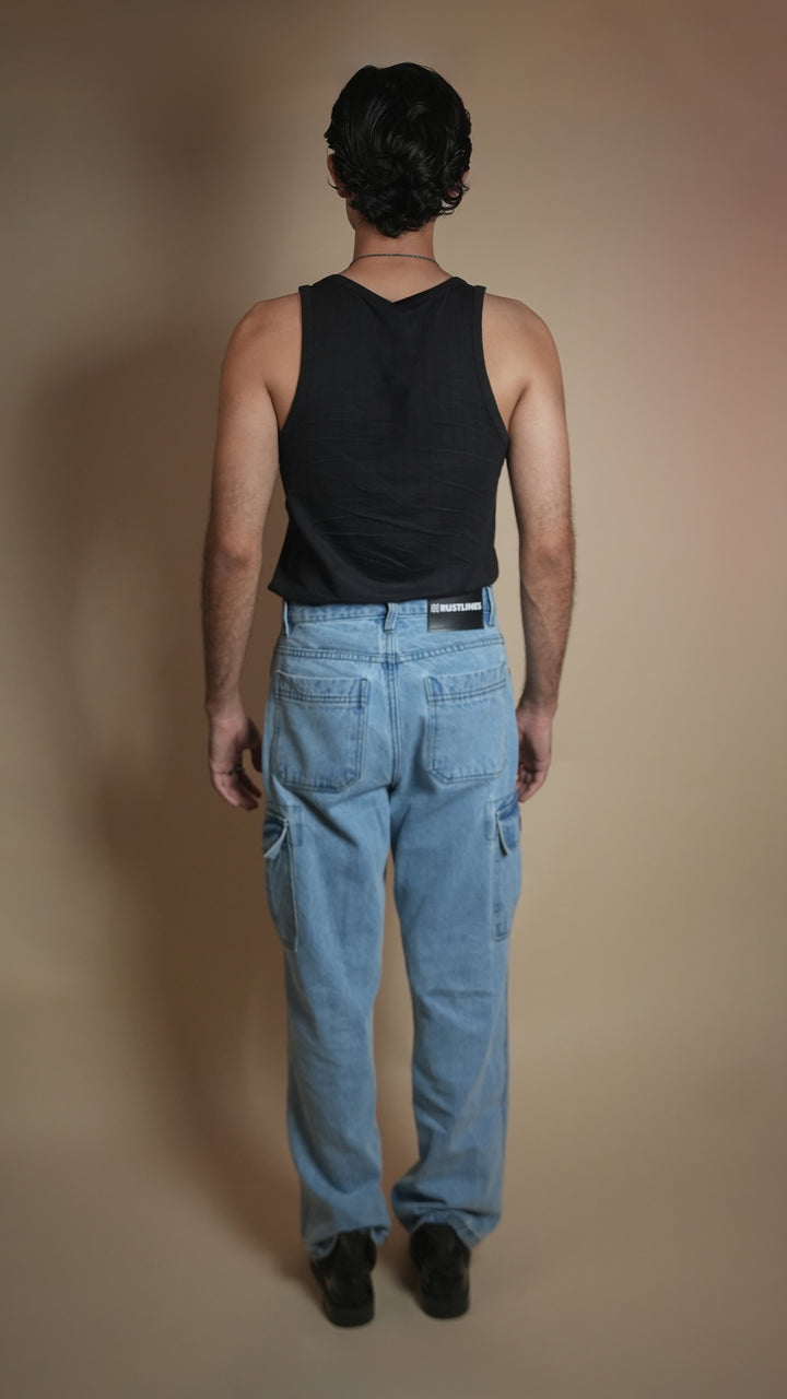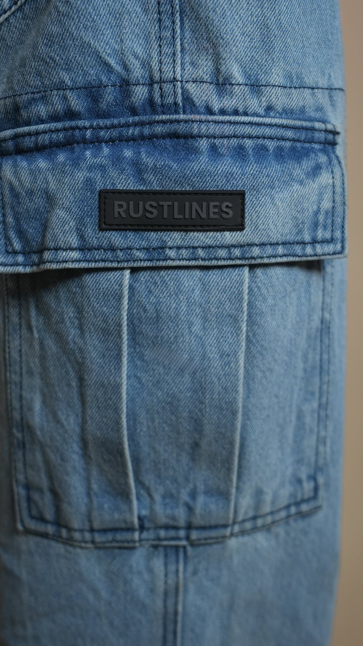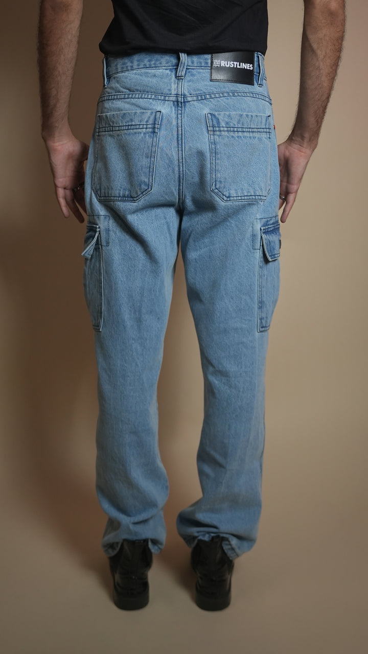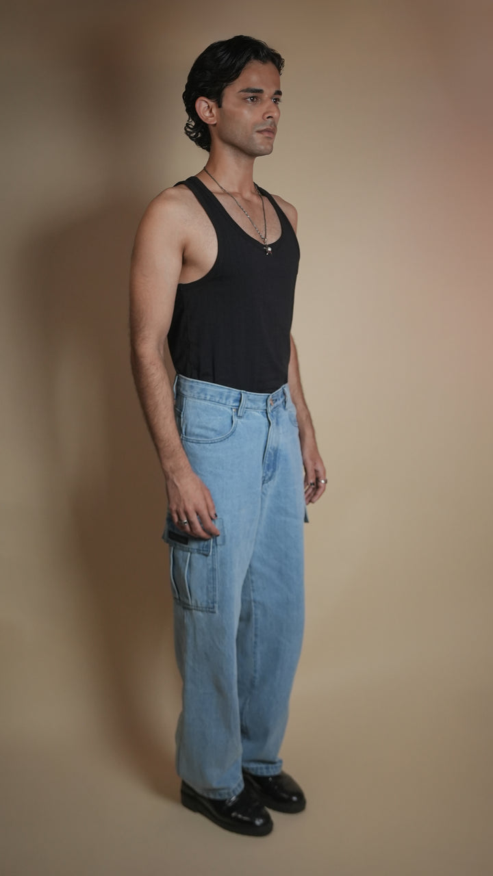 Ice-blue denim, cargo pockets, relaxed utility style