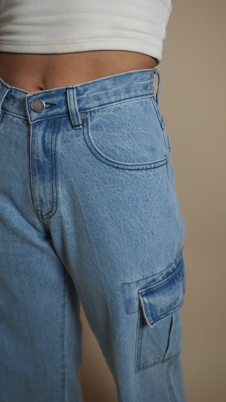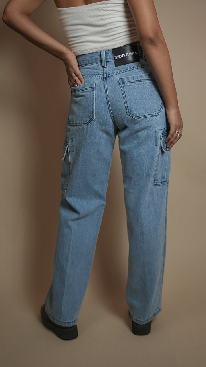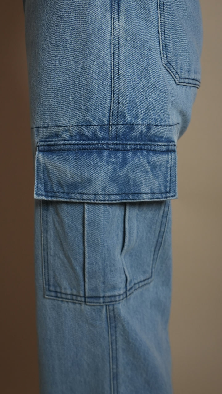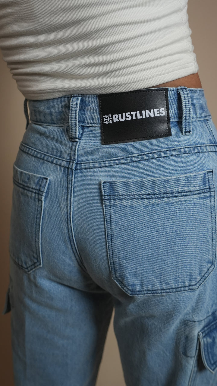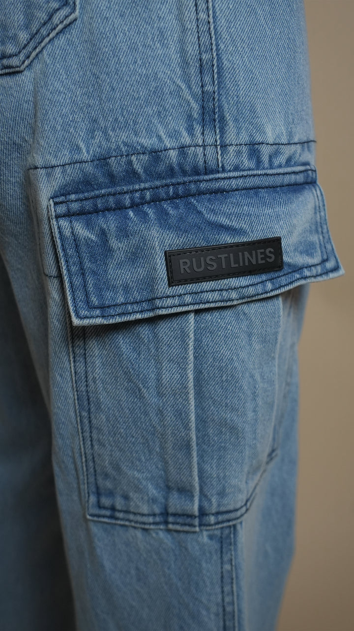 Cut from heavyweight 13.5 oz non-stretch cotton denim, these cargos bring an oversized, baggy silhouette in a striking ice-blue wash. Designed with 6 functional pockets, silver hardware, and YKK zippers for long-lasting performance, plus contrast stitching for a sharp, elevated look. Hand-cut and handcrafted for a rugged, urban finish.
