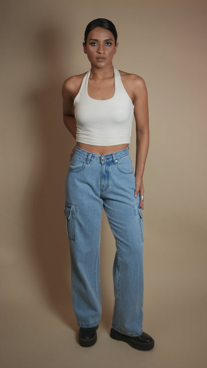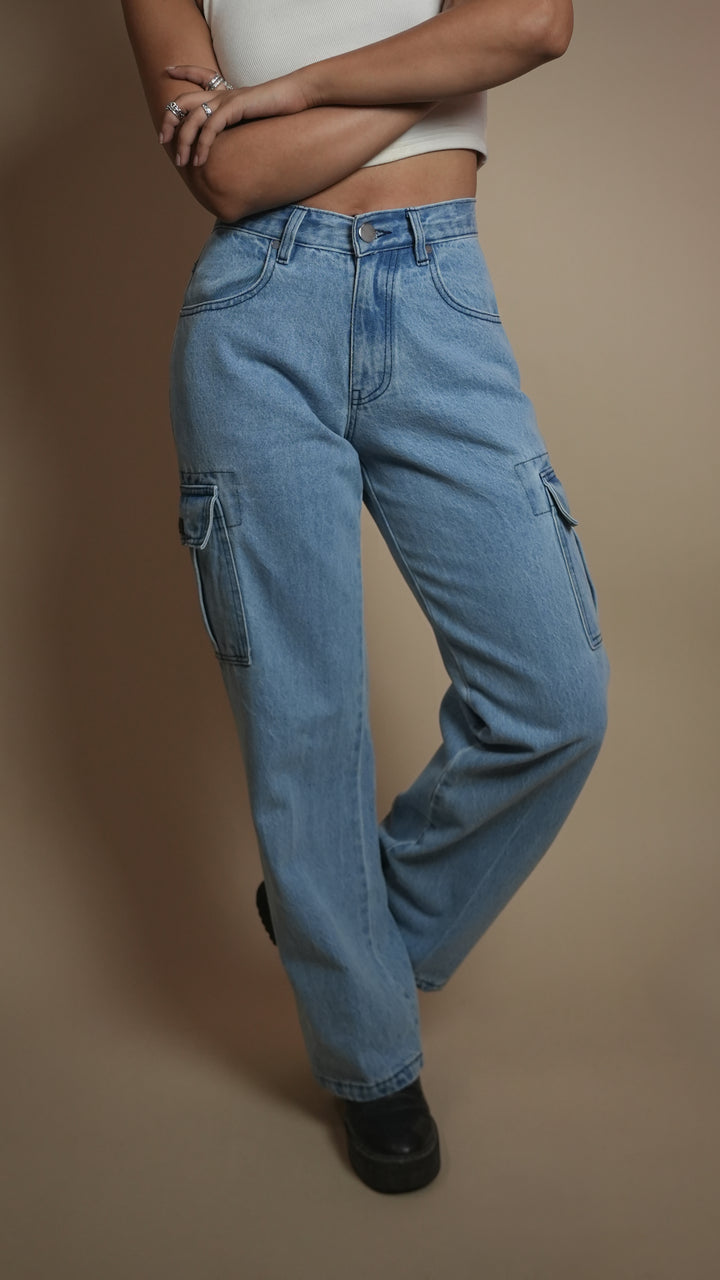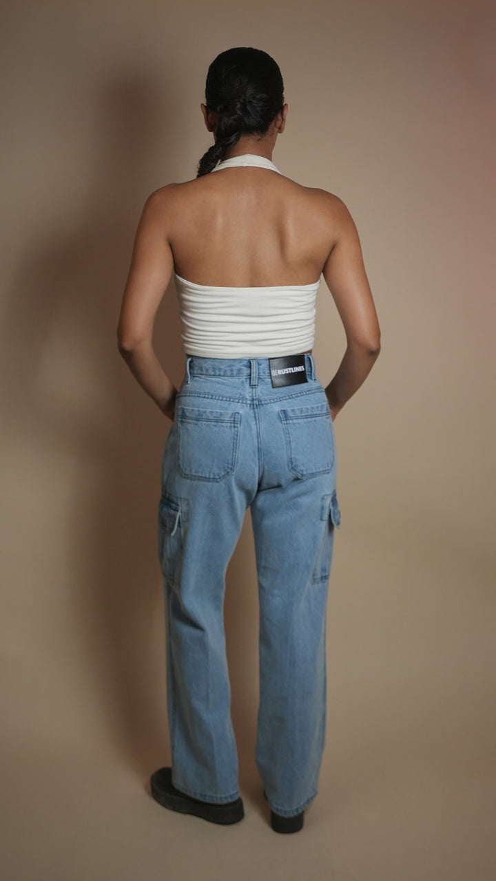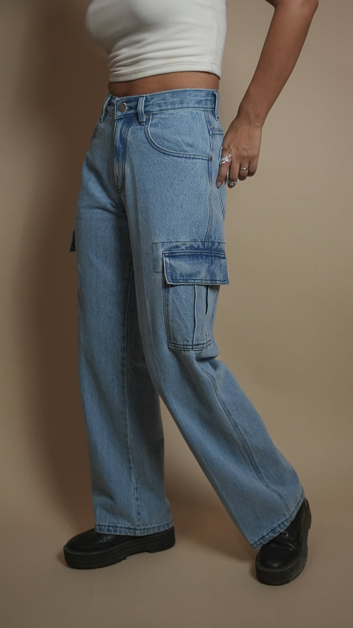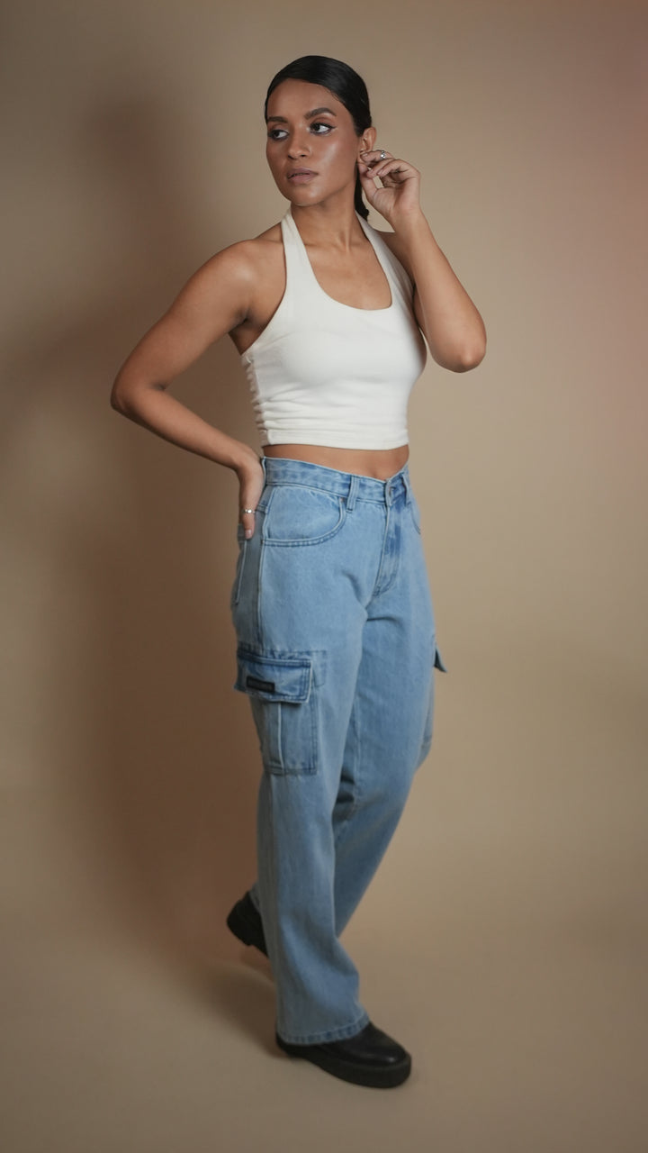 Cut from heavyweight 13.5 oz non-stretch cotton denim, these cargos bring an oversized, baggy silhouette in a striking ice-blue wash. Designed with 6 functional pockets, silver hardware, and YKK zippers for long-lasting performance, plus contrast stitching for a sharp, elevated look. Hand-cut and handcrafted for a rugged, urban finish.